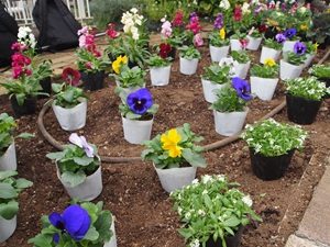 参加者は集合後、すぐに作業を開始。まず、花壇全体のバランスを確認しながら、ハボタン、パンジー、ストック、アリッサムの苗を配置していきます。次に、それらをポットから取り出し、丁寧に土に植える作業を進めました。これと並行して、道路沿いのフェンスの下には、チューリップ、スノーフレーク、水仙の球根も植え付けました。