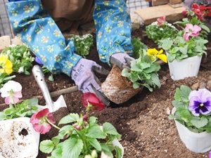 土を掘り起こし、ポットから取り出した花苗を植えます