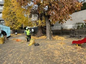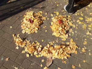 今回の活動は、イチョウの落ち葉掃除を兼ねた「みんなで落ち葉はき&落ち葉でアート」。土・日を利用して、2日間にわたっての実施です。