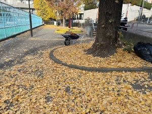 集まった人から作業を開始し、イチョウの落ち葉を竹ぼうきで掃き集めて、ビニール袋に詰めていきます。道路の向こう側の落ち葉も掃き集めます。量の多さに、うっすら汗ばむほど。