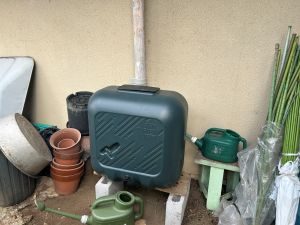 支援で購入した雨水タンク。花壇の水やりに活用します