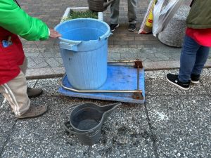 10時の集合時間、パデュ通りにおそろいの赤いエプロンを着けた15人のメンバーが集まりました。このエプロンは、今年度『みど*リンク』の支援で初めて作ったもの。グループの新しいマークもプリントされています。