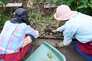 まず各自が受け持つ花壇に移動し、雑草や落ち葉を取り除いていきます。集めた雑草や落ち葉は、「花とみどりの学習館」近くの作業スペースに運び、コンポストに入れます。