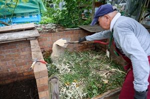 集めた雑草はコンポストへ。米ぬかと混ぜ、数ヶ月発酵させます